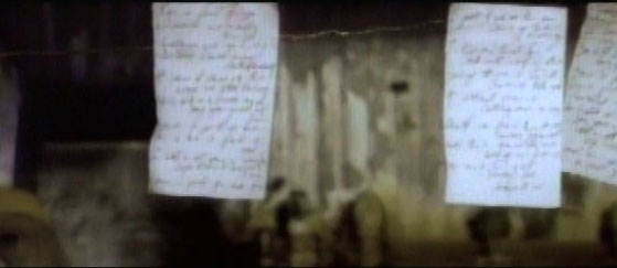 The lyrics cover the screen as he walks away.